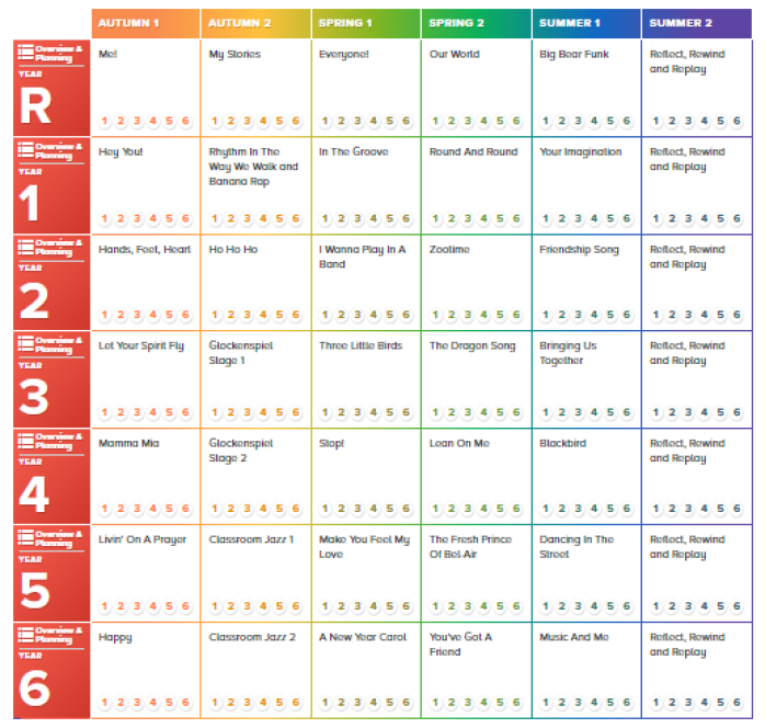 Each year group completes a unit of work from the scheme every other term. Each unit of work focuses on the strands of musical learning which corresponds with the National Curriculum objectives for Music: